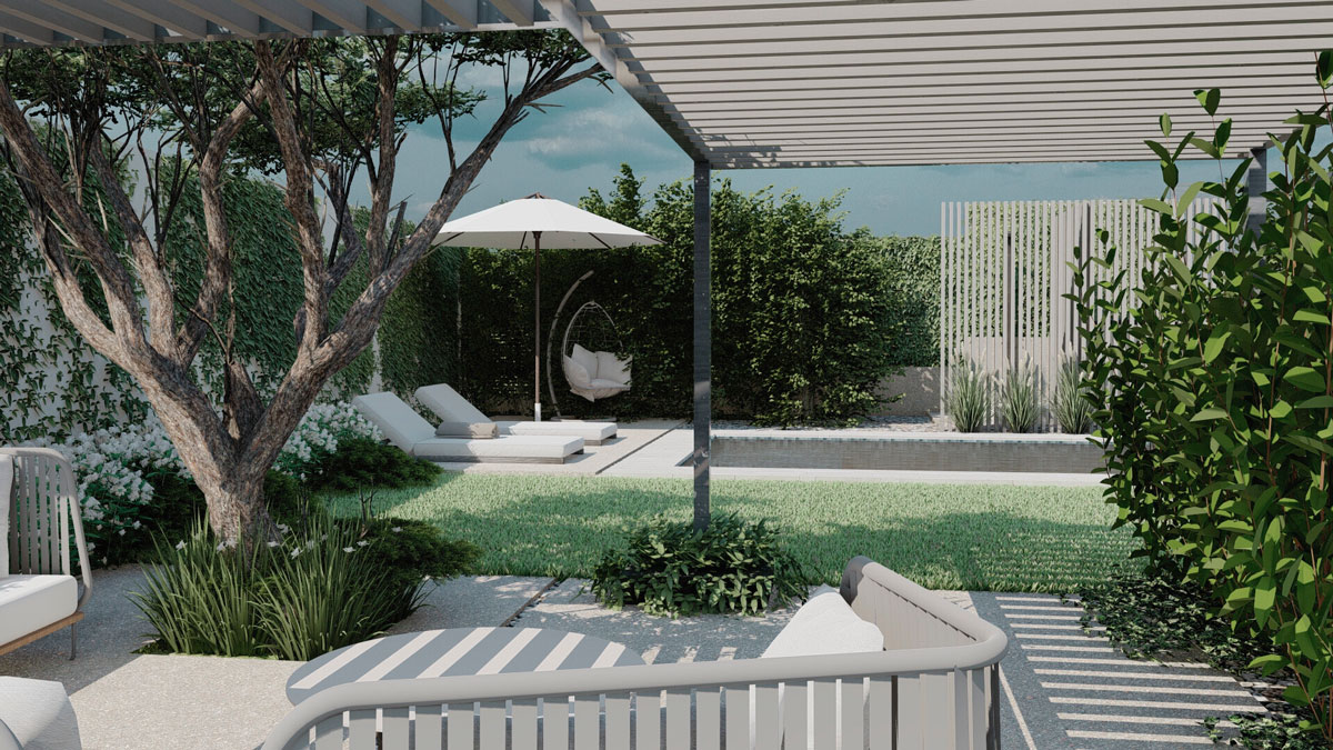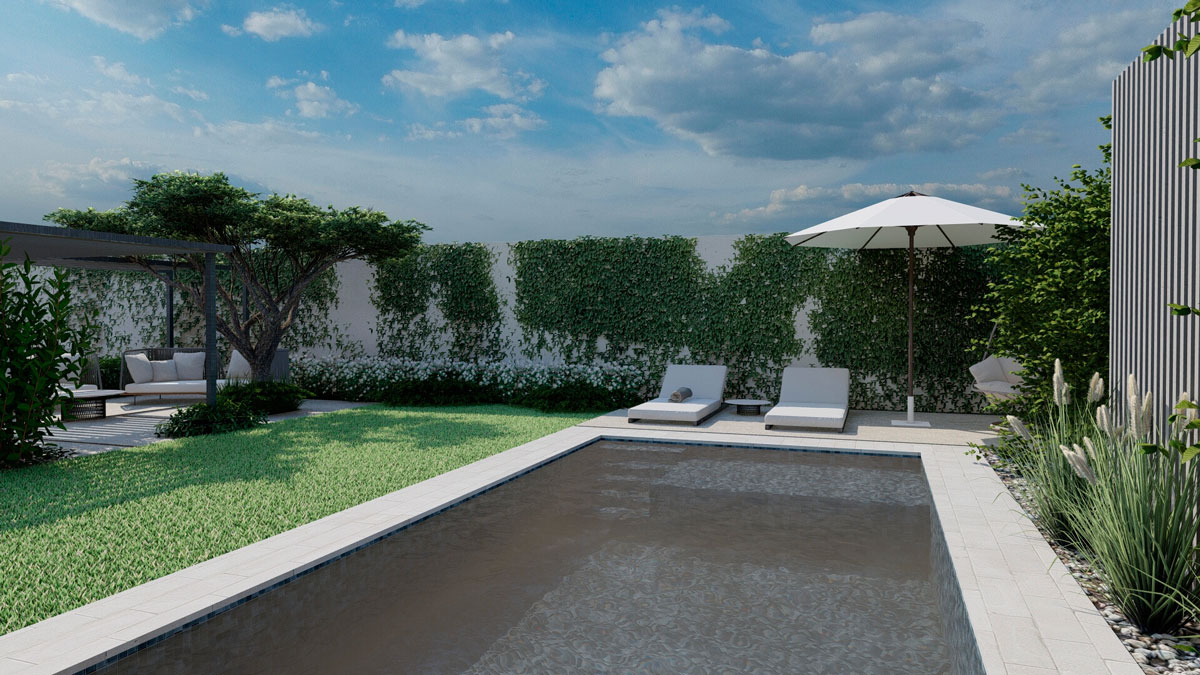 La piscina se extiende junto a un cómodo solárium, invitando al descanso. Una pérgola, ubicada cerca de la piscina, proporciona sombra durante las reuniones al aire libre.