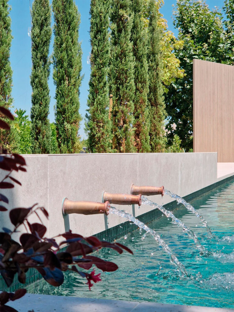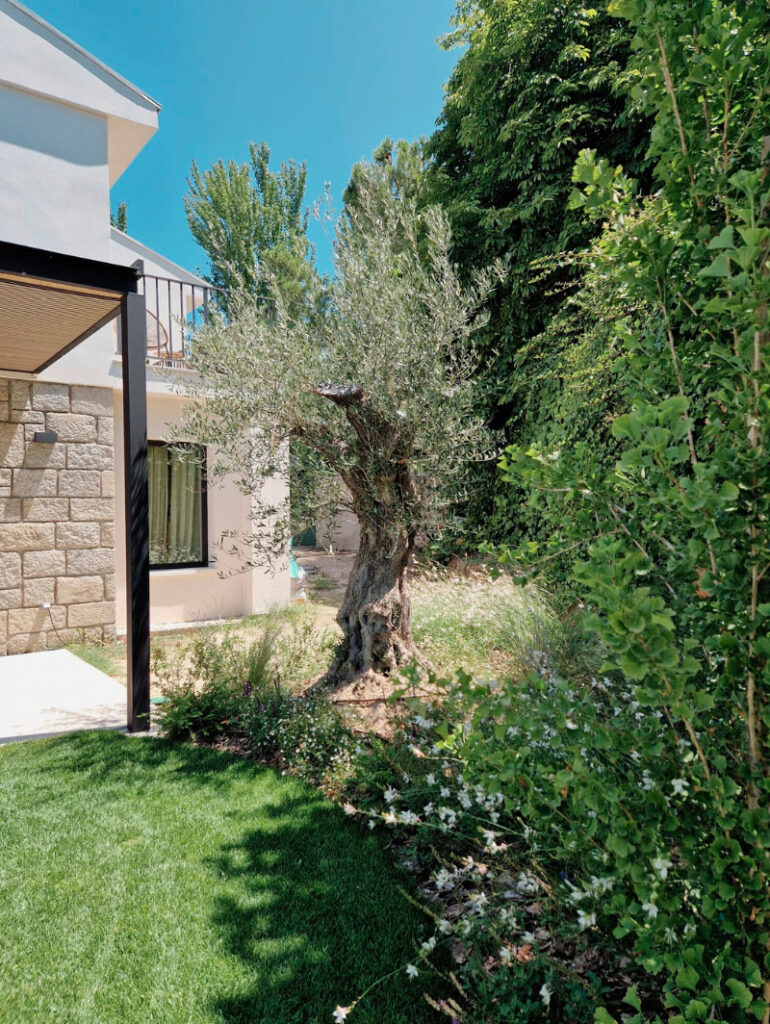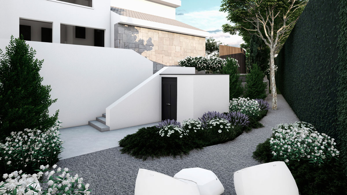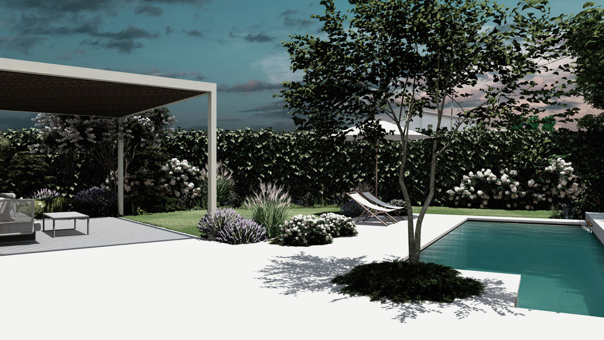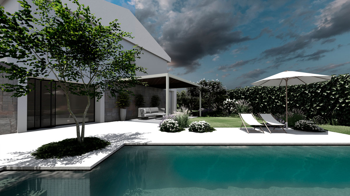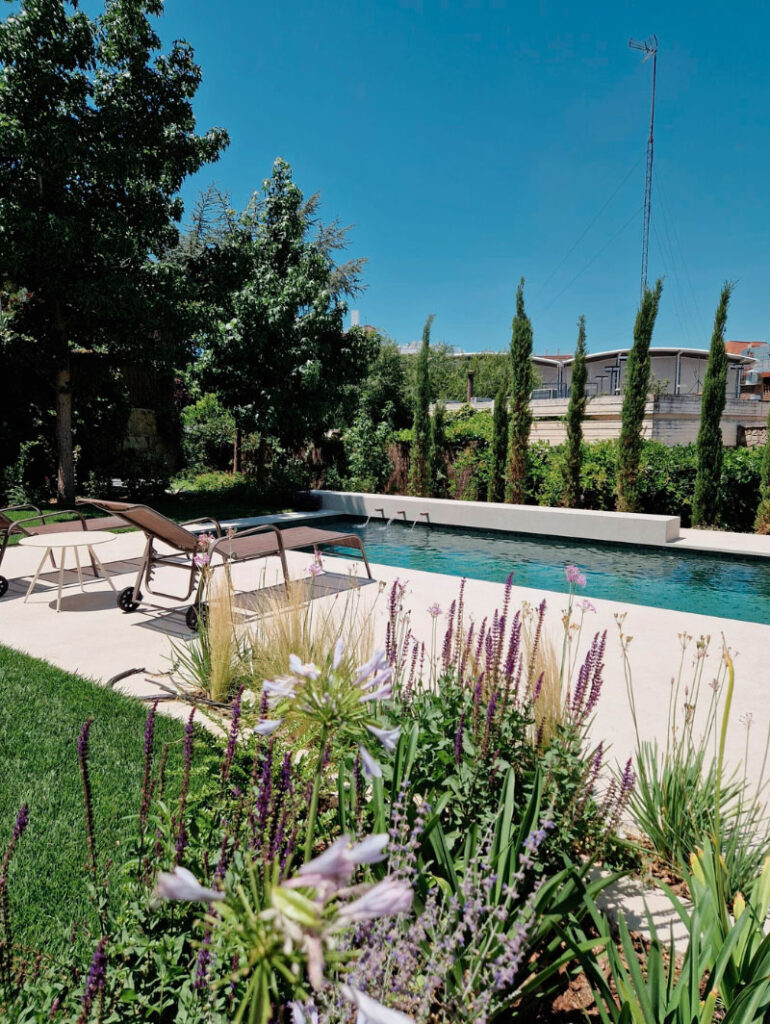 El desarrollo de este jardín parte de una piscina de estilo clásico, donde el reto fue crear la armonía de elementos naturales y tradicionales a partir de materiales tan diferentes como la piedra natural y la madera sintética.