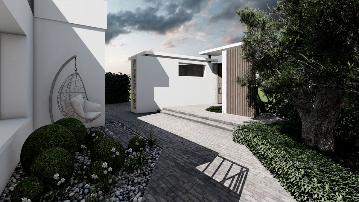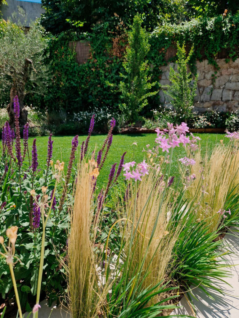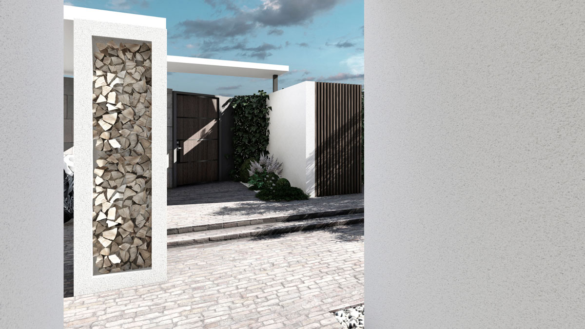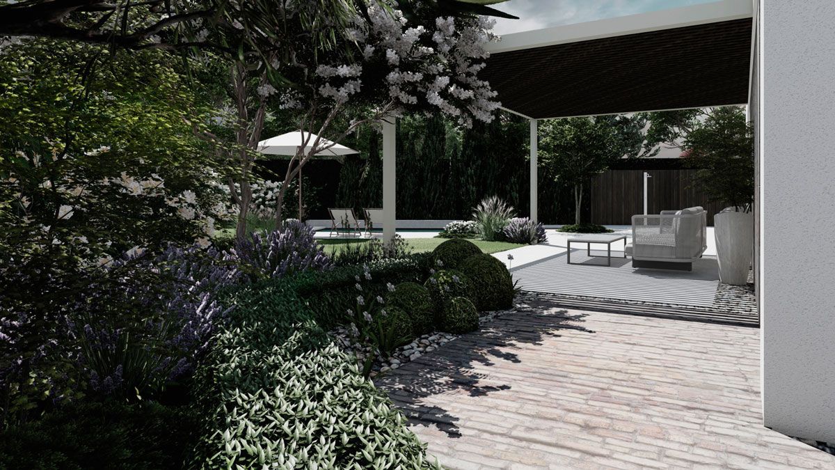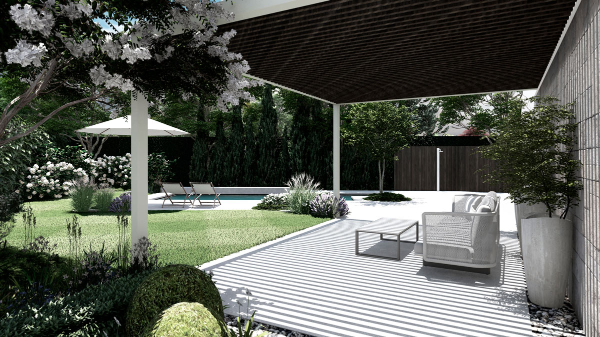 El desarrollo de este jardín parte de una piscina de estilo clásico, donde el reto fue crear la armonía de elementos naturales y tradicionales a partir de materiales tan diferentes como la piedra natural y la madera sintética.