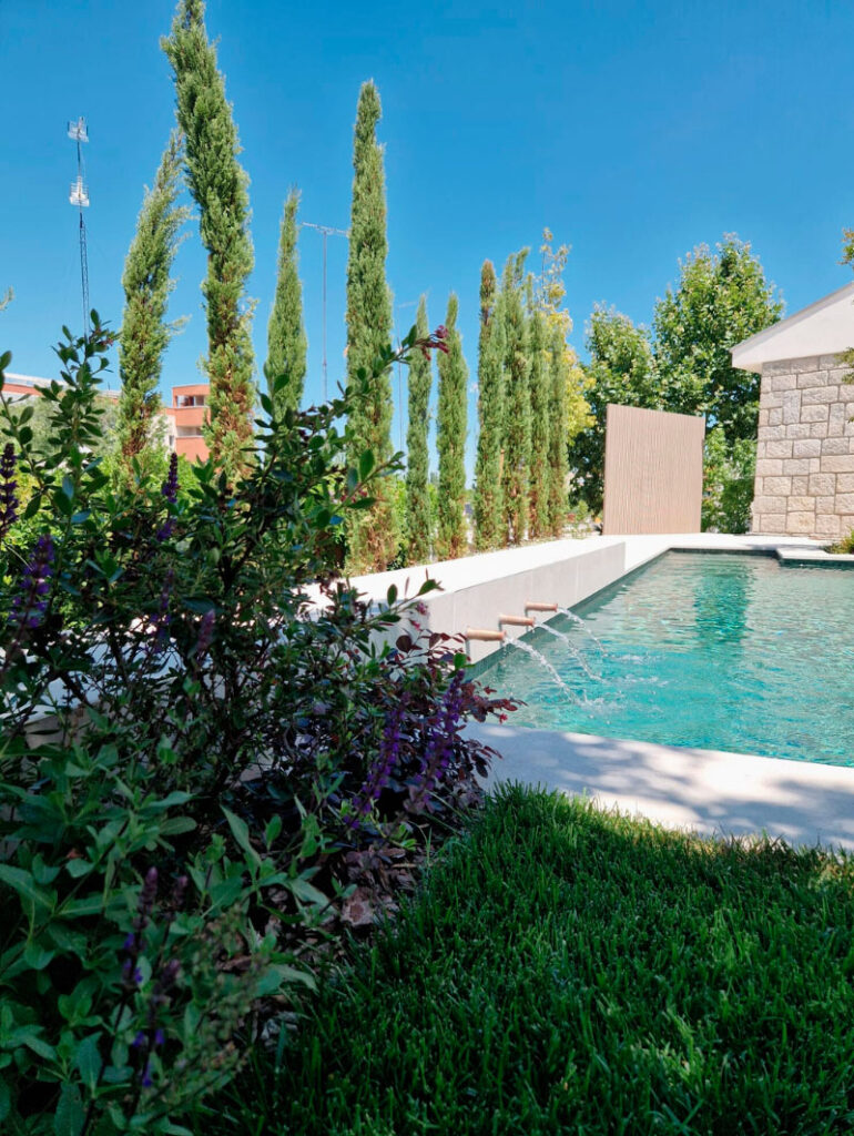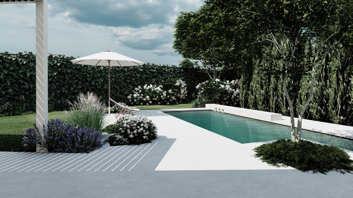 La piscina, se fusiona con el entorno, rodeada de exuberante vegetación, arbustos recortados y árboles de sombra.